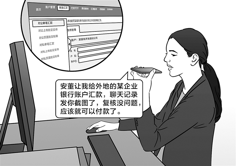 黃某某輕信上述信息,在未向董事長(zhǎng)安某某當(dāng)面或電話核實(shí)、且未見到任何書面審批手續(xù)的情況下,擅自向外地企業(yè)銀行賬戶發(fā)起、錄入網(wǎng)銀支付,并將聊天群內(nèi)的截圖發(fā)送給該公司會(huì)計(jì)華某某(另案處理),要求其進(jìn)行復(fù)核付款。