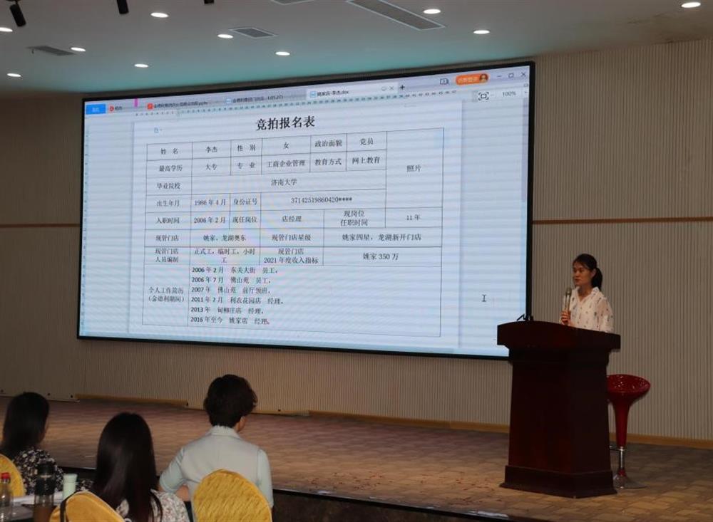 公司成立競拍領導小組,堅持“公開競拍、平等競爭、擇優(yōu)錄取、注重實績”的原則,鼓勵員工毛遂自薦、積極報名。競拍店長依次上臺分別從管理門店2021年度經(jīng)營收入目標、競拍上崗后的工作思路、設想及經(jīng)營措施等方面進行演講。
