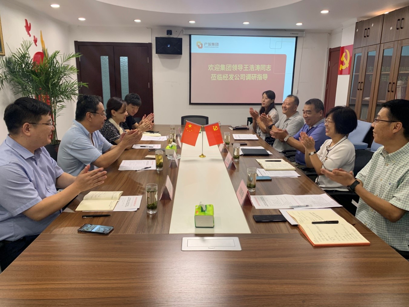 8月5日上午,產(chǎn)發(fā)集團(tuán)黨委委員、副總經(jīng)理王浩濤同志一行到濟(jì)南經(jīng)濟(jì)發(fā)展有限公司進(jìn)行調(diào)研。企管集團(tuán)黨委書記、董事長張欣同志,黨委副書記、總經(jīng)理朱風(fēng)亮同志等陪同調(diào)研。經(jīng)發(fā)公司黨支部書記、執(zhí)行董事長劉濤同志以及經(jīng)發(fā)公司經(jīng)營班子成員迎接調(diào)研并匯報(bào)工作。