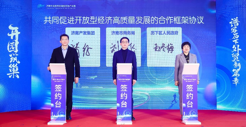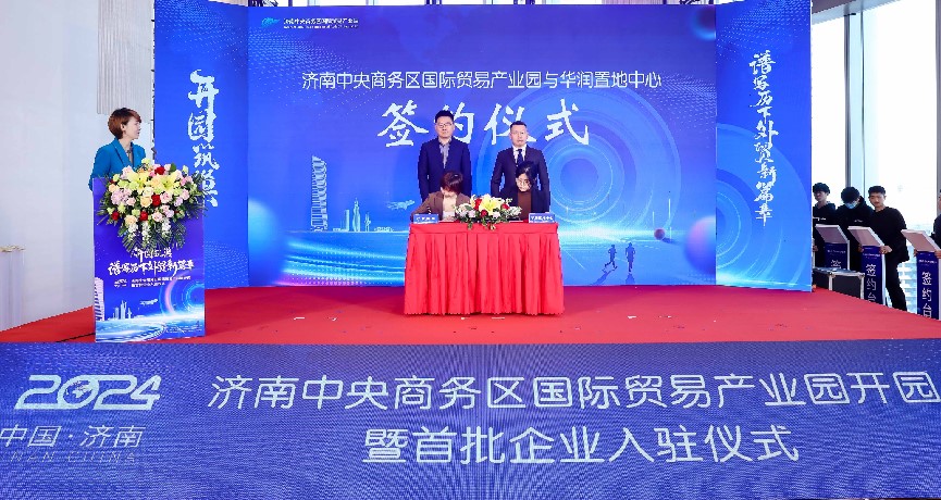 在入駐簽約環(huán)節(jié),濟(jì)南國(guó)商園區(qū)運(yùn)營(yíng)管理有限公司總經(jīng)理陳蕾與華潤(rùn)置地中心項(xiàng)目負(fù)責(zé)人李靜宜簽訂了委托運(yùn)營(yíng)協(xié)議;劉燕飛、趙冬梅、褚征分別代表濟(jì)南市商務(wù)局、濟(jì)南市歷下區(qū)人民政府、濟(jì)南產(chǎn)發(fā)集團(tuán)共同簽署《共同促進(jìn)開放型經(jīng)濟(jì)高質(zhì)量發(fā)展合作框架協(xié)議書》;王紅、楊傳軍、趙治文、楊福濤、王海清、黃蓓、邵丹丹共同按下啟動(dòng)開園按鈕,宣告濟(jì)南中央商務(wù)區(qū)國(guó)際貿(mào)易產(chǎn)業(yè)園正式開園。